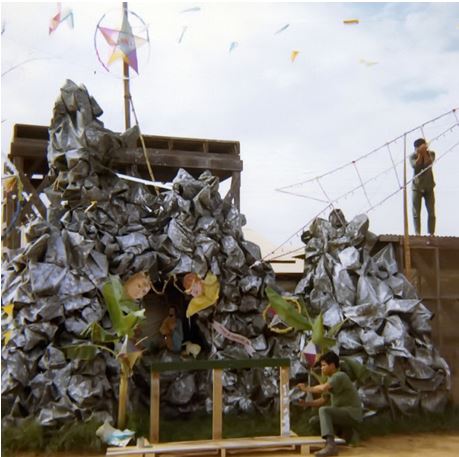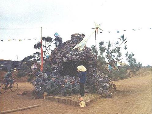 Những Người Lính tiền đồn đón Noel bằng vật liệu tác chiến sẵn có. Nào ống phóng lựu M72 làm trụ, đạn đại liên M60 làm lá thông, đạn M79 làm dây đèn trang trí cùng với 5 quả đạn súng cối, trên đỉnh làm ngôi sao và vài thùng đạn làm đế cây phía dưới. Thật tuyệt, một hình thức trang trí đón mừng Giáng Sinh của Lính.
